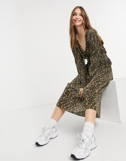 ASOS DESIGN midi plisse v neck long sleeve dress in black and yellow